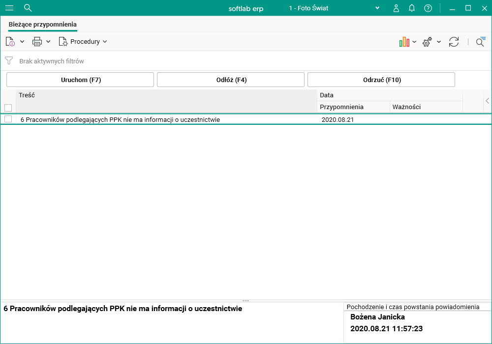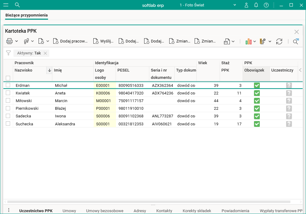 W aplikacji Softlab HR by Asseco zostało dodane przypomnienie o braku informacji dotyczącej przystąpienia pracownika do PPK bądź jego rezygnacji z udziału w tym programie. Dotyczy ono tych pracowników, którzy spełniają określone w ustawie o PPK warunki przystąpienia do programu i nie złożyli oświadczenia o rezygnacji z udziału w tym programie.