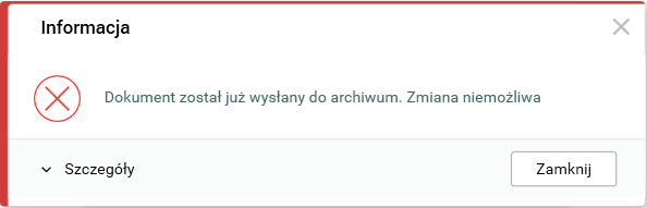 Po przesłaniu dokumentu do archiwum, zmiana przypisania do części dokumentacji pracowniczej nie będzie już możliwa. Przy próbie zmiany przypisania takiego dokumentu system wyświetli następujący komunikat: