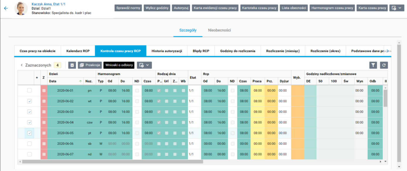 Pracownikowi udostępniono uproszczoną wersję słownika Kontrola czasu pracy RCP w postaci pulpitu o tej samej nazwie. Daje on pracownikowi dostęp do jego harmonogramu oraz ewidencji czasu pracy.