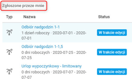 Rys. Sekcja Zgłoszone przeze mnie na dashboardzie głównym