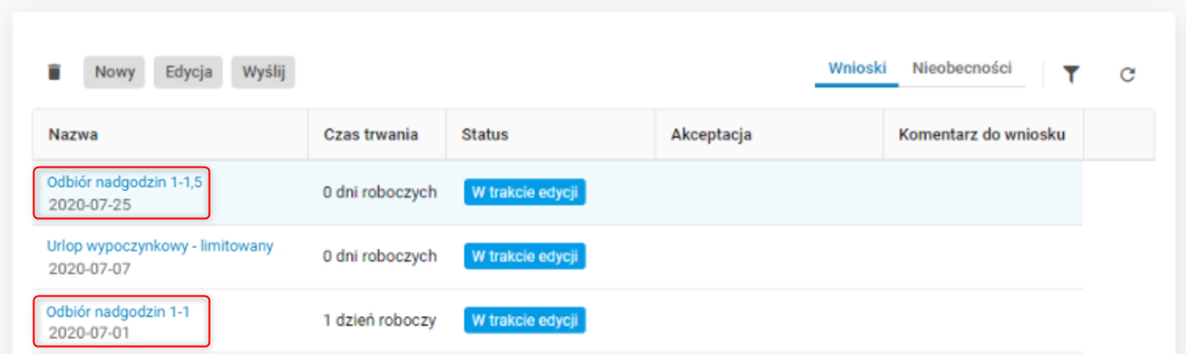 Na tym pulpicie udostępniono procedurę Wniosek o odbiór nadgodzin: