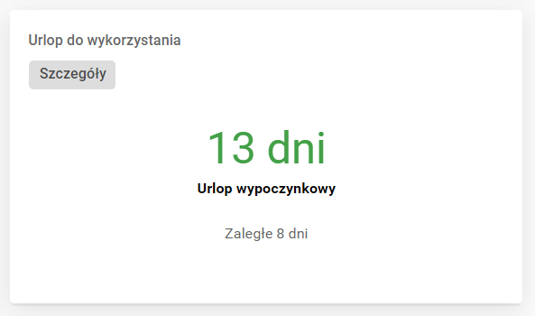 Sekcja Urlop do wykorzystania przedstawia stan limitów urlopowych pracownika. W sekcji znajduje się przycisk Szczegóły, który otwiera okno z danymi uzupełniającymi.