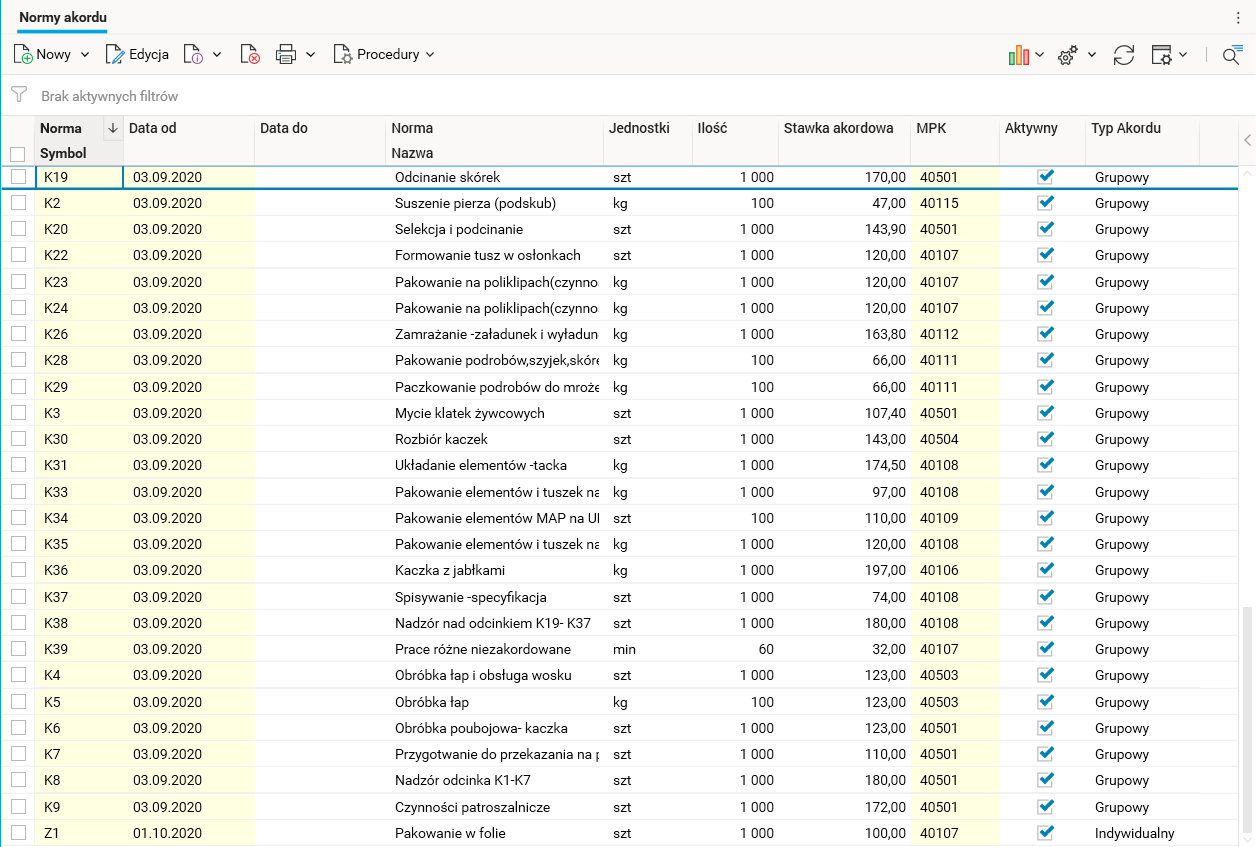 · Indywidualny – wynagrodzenie akordowe jest liczone jako iloczyn wypracowanych przez pracownika jednostek pracy (sztuk/kilogramów/minut) oraz stawki ustalonej w słowniku Normy akordu,