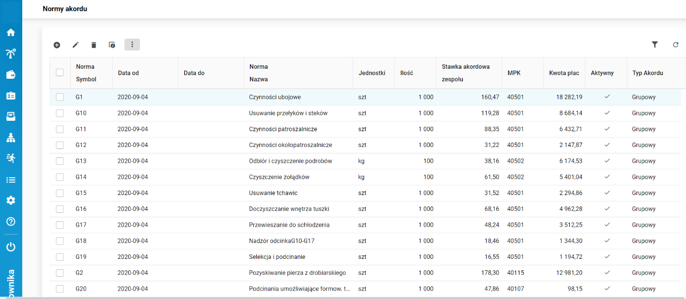 Wynagrodzenie akordowe to stawka akordowa przemnożona przez ilość wykonanej pracy. Słownik Normy akordu definiuje stawki akordu, zwane dalej normami akordu. Słownik przechowuje następujące dane opisujące normy akordu: symbol i nazwa normy, data obowiązywania, jednostka miary wykonanej pracy, ustalona dla danej normy ilość, podstawowa stawka wynagrodzenia oraz typ akordu.