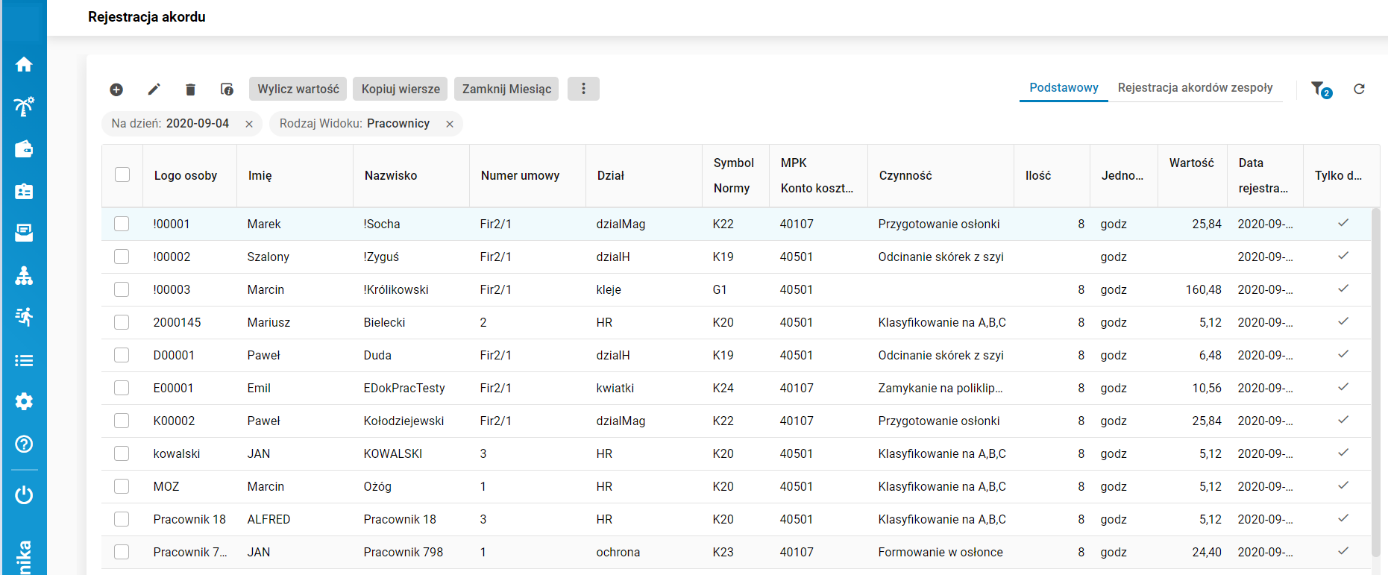 Rejestrację akordu należy rozpocząć od wskazania, w jakiej normie akordu będą pracować poszczególni pracownicy danego dnia. Filtr Na dzień pozwala wyświetlić dane za wskazany dzień.