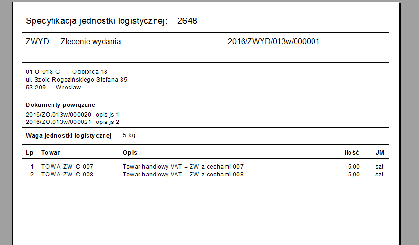 Wydruk specyfikacji jednostki logistycznej < Wróć do poprzedniej strony | 6 września, 2016 2814 Na wydruku specyfikacji jednostki logistycznej dodane zostały dwie nowe sekcje: lista dokumentów (wraz z ich opisami) powiązanych z jednostką oraz waga jednostki logistycznej. rys. Specyfikacja jednostki logistycznej – przykład wydruku