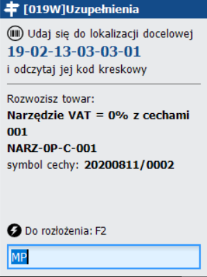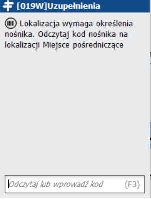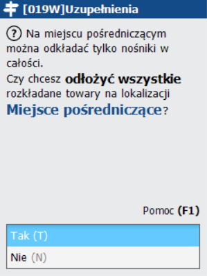 W związku z powyższym po odczytaniu kodu kreskowego punktu pośredniczącego system zapyta, czy chcemy odłożyć wszystko na tej lokalizacji. Jeżeli się zgodzimy, to konieczne jest podanie także nośnika, na który odłożymy towar. Gdy zrezygnujemy z tej opcji, wrócimy do ekranu skanowania lokalizacji docelowej.