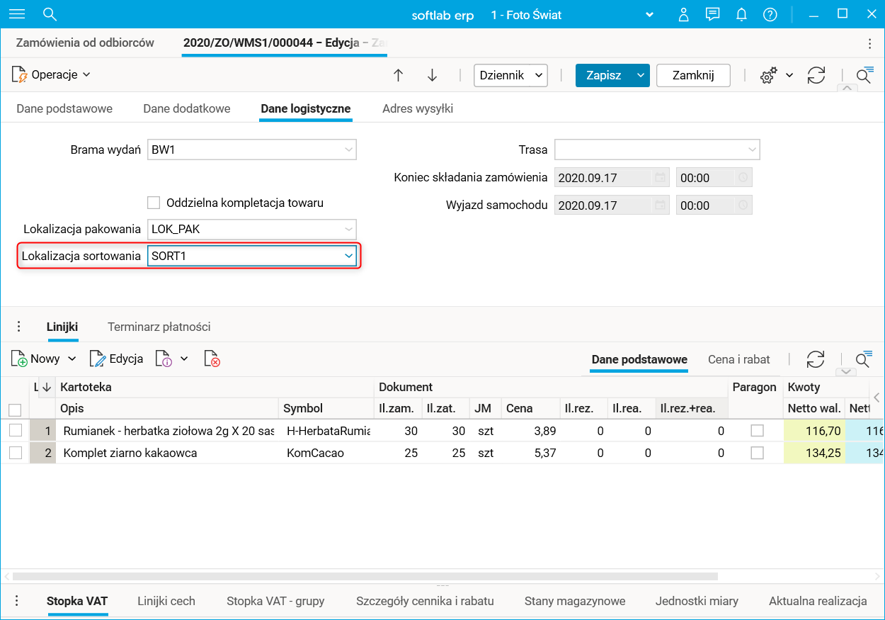 W nagłówku dokumentu zamówienia od odbiorcy, na zakładce Dane logistyczne dodano pole Lokalizacja sortowania. Określamy w nim lokalizację, w której zamówienie zostanie posortowane, wybierając z listy stanowisko przeznaczone do sortowania. Dzięki określeniu lokalizacji sortowania na dokumencie system poprosi operatora aplikacji WMS Client o odwiezienie skompletowanego towaru na wskazaną lokalizację. Towar znajdujący się na tejże lokalizacji będzie mógł w następnym kroku zostać poddany procesowi sortowania.