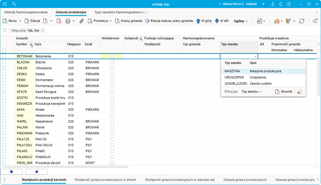 W wersji 100 systemu wprowadzono możliwość powiązania gniazd produkcyjnych z typem harmonogramu (rodzajem dowodu harmonogramu).