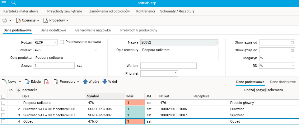 Receptura zawiera dwie linijki przychodowe (czerwone tło w kolumnie Kartotek; Ilość), ale tylko ostatnia linijka stanowi definicję przychodu odpadu (kolumna Rodzaj pozycji schematu).