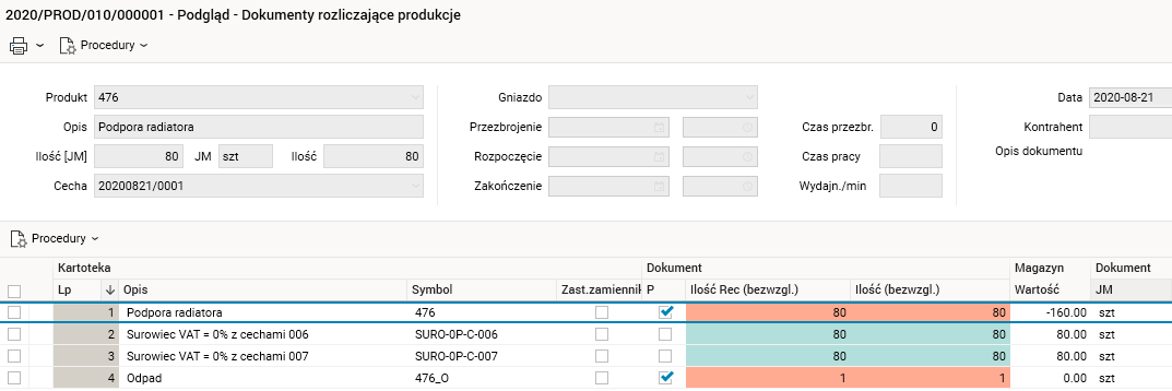 Jak widać, odpad z ostatniej linijki został przyjęty z wartością zerową (kolumna Magazyn; Wartość), a całość kosztu wytworzenia została przypisana produktowi.
