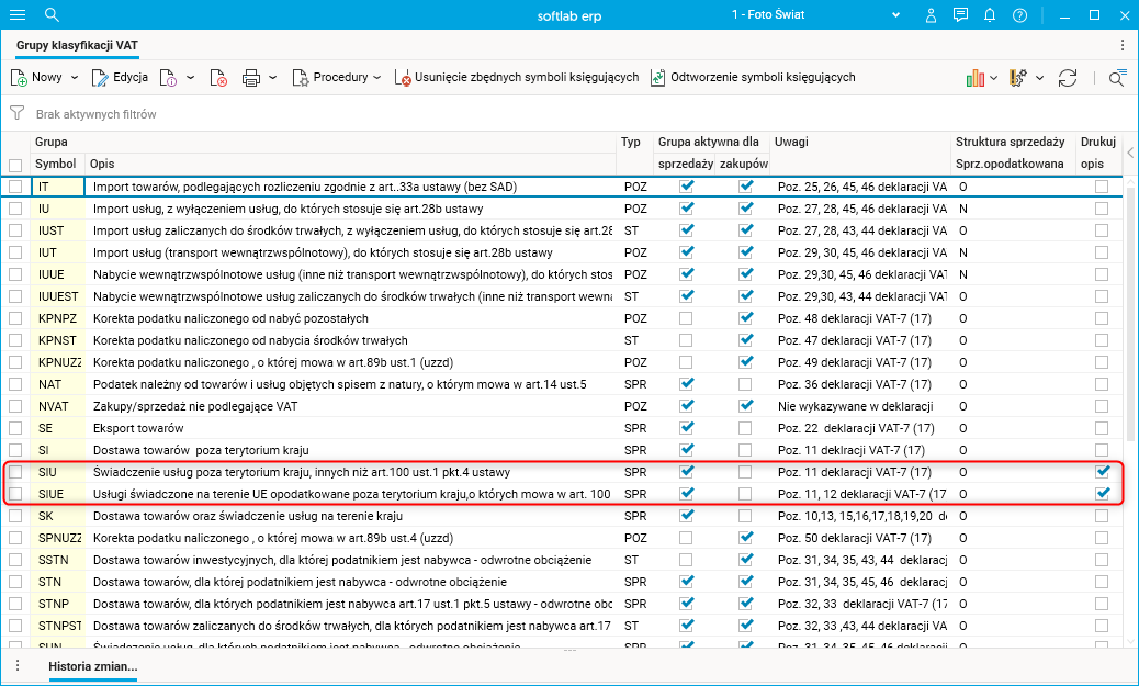 W słowniku Grupy klasyfikacji VAT dodano kolumnę Drukuj opis służąca do oznaczenia grupy klasyfikacji. W przypadku wystąpienia na wydruku linijki z fakturowaniem usługowym w dokumencie z przyporządkowaną tą grupą klasyfikacji, na wydruku pojawi się opis usługi. Opcja ta została domyślnie włączona dla grup klasyfikacji SIU i SIUE.
