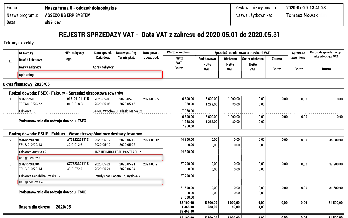 W systemie Softlab ERP na wydrukach rejestru VAT sprzedaży – Rejestr sprzedaży wg grup stawek VAT i Rejestr sprzedaży wg stawek VAT (pionowo) – dodano prezentację opisu usługi.