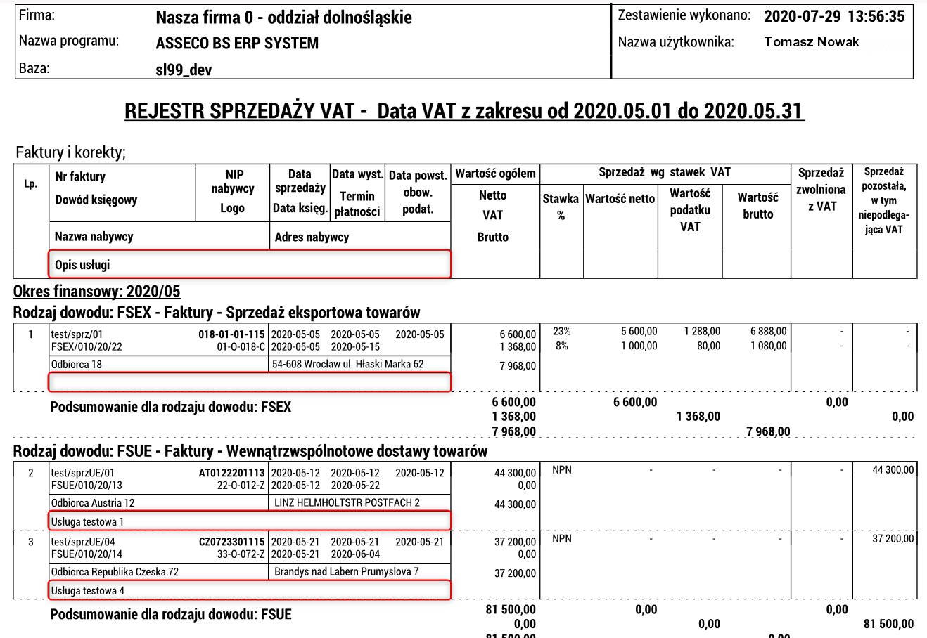 Dwa wydruki rejestru VAT dla sprzedaży, czyli Rejestr sprzedaży wg grup stawek VAT i Rejestr sprzedaży wg stawek VAT (pionowo), dostosowano tak, aby uwzględniały opis usługi, o ile tylko taki istnieje, na co najmniej jednym z wybranych do zestawienia dokumentów.