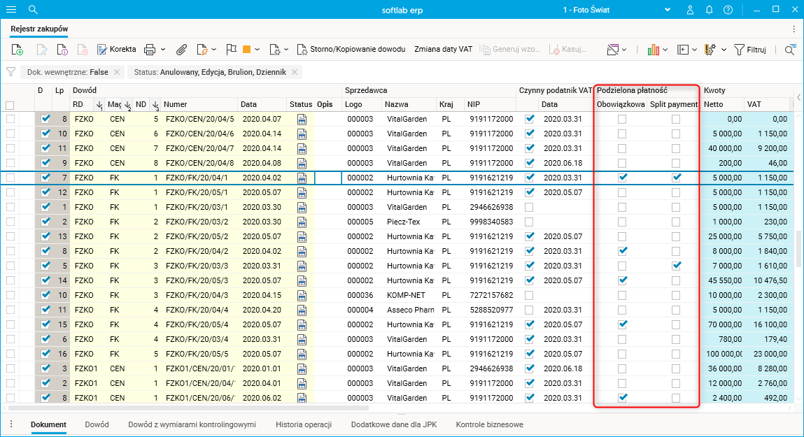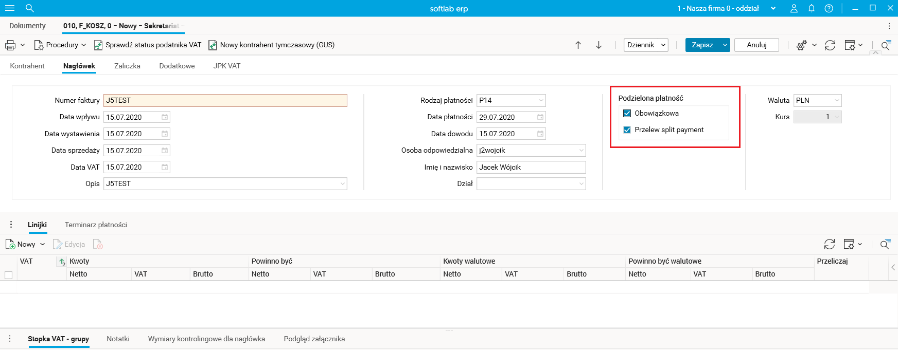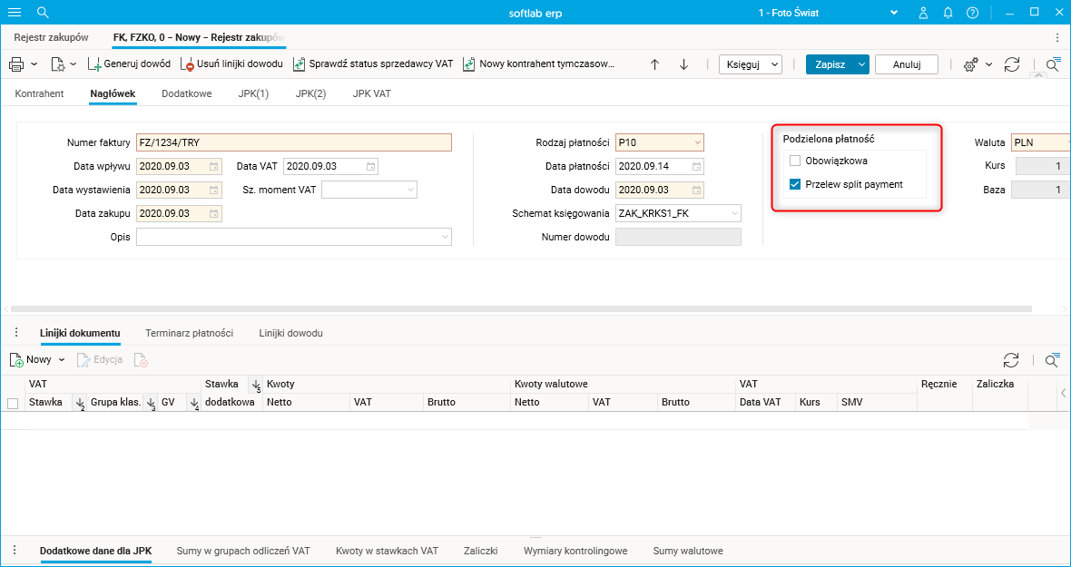 W systemie Softlab ERP zmodyfikowano obsługę znacznika dotyczącego podzielonej płatności podczas ewidencji faktur zakupu.
