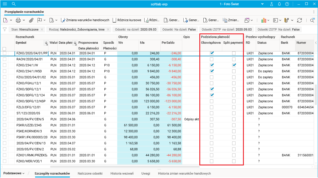 Zmodyfikowano słownik Przeglądanie rozrachunków, w tym jego dwa przekroje Rozrachunki tylko z przelewami przygotowanymi lub wysłanymi oraz Rozrachunki bez pełnego pokrycia przelewami. W każdym z nich oba pola dotyczące mechanizmu split payment zostały umieszczone w grupie dwóch kolumn:
