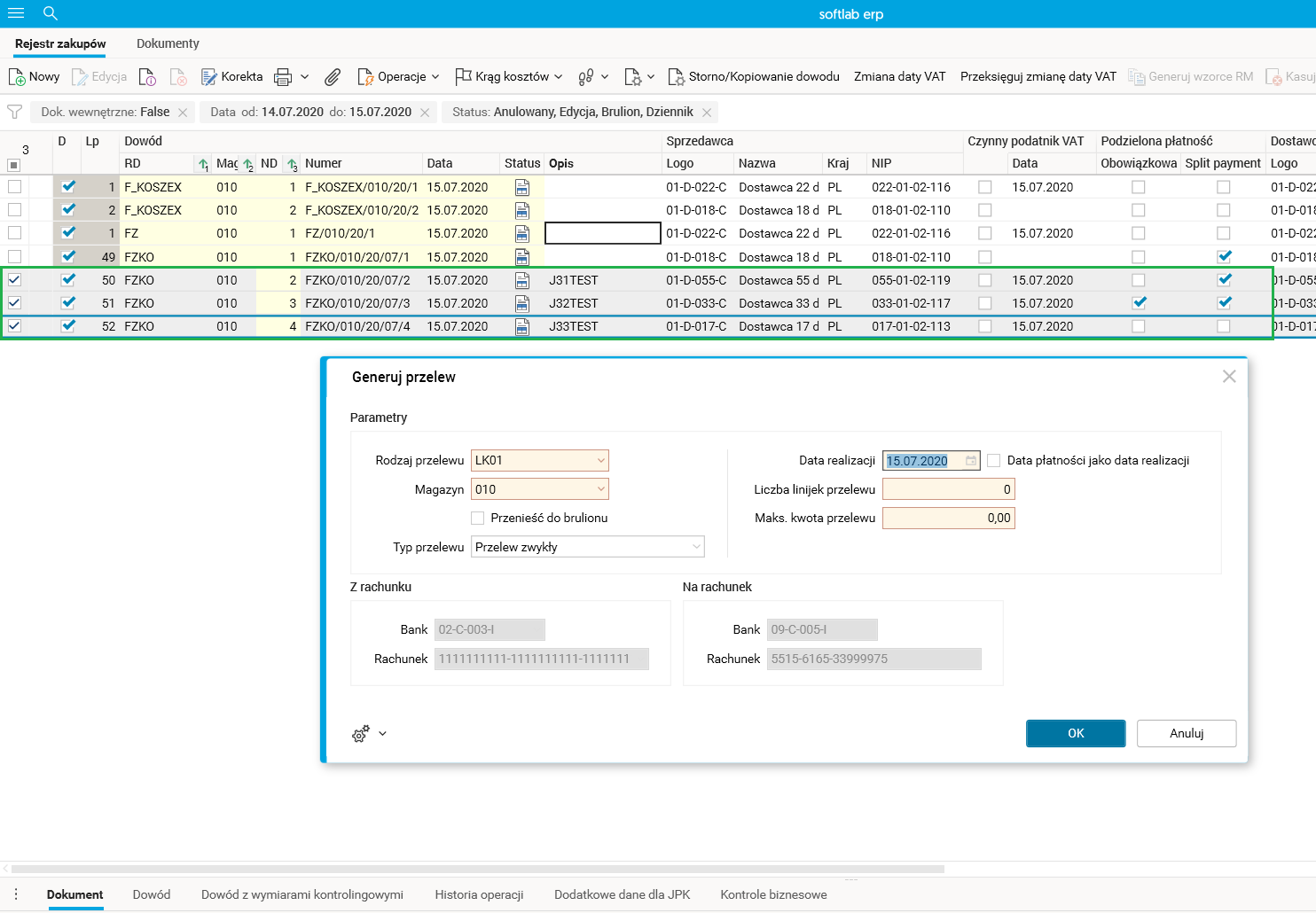 Rys. Generowanie przelewów do trzech zaznaczonych dokumentów zakupu
