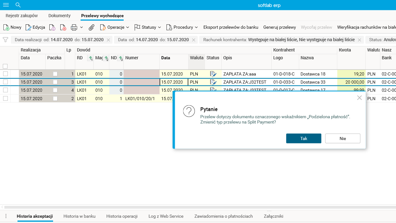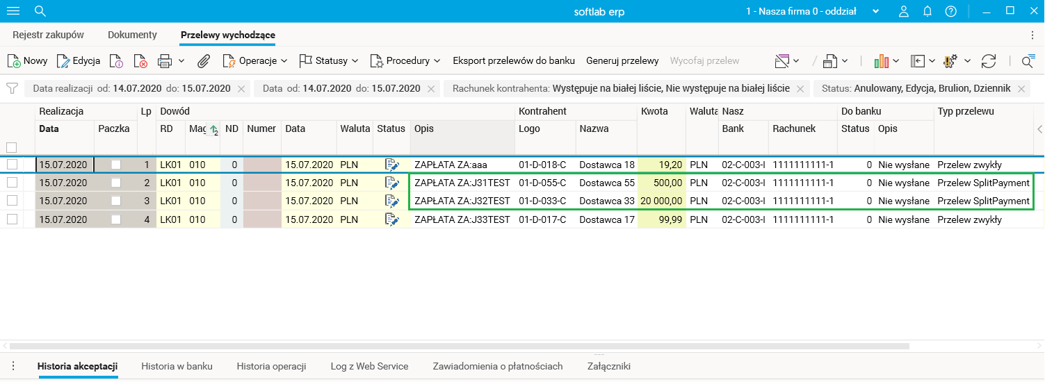W efekcie działania procedury, utworzony został jeden przelew zwykły oraz dwa przelewy typu split payment – wszystko zgodnie ze znacznikiem Przelew split payment na dokumencie.