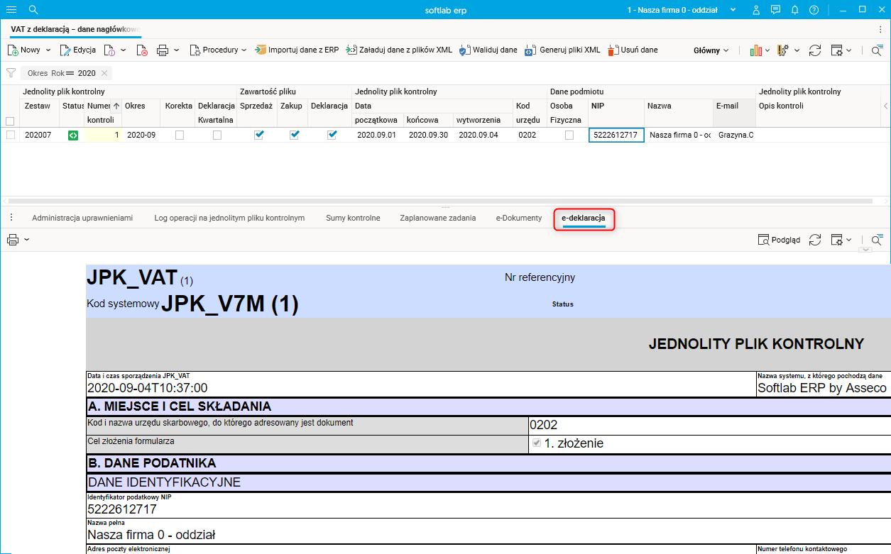 W słowniku VAT z deklaracją – dane nagłówkowe dodano szczegół e-deklaracja. Przedstawiona jest w nim deklaracja VAT-7 wersja 21 oraz VAT-7K wersja 15 w formacie przygotowanym przez Ministerstwo Finansów.
