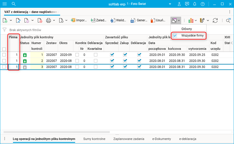 W słowniku VAT z deklaracją – dane nagłówkowe dodano przekrój Wszystkie firmy, w którym można zobaczyć, jaki jest status wszystkich deklaracji z wybranego okresu, a także podpisać i wysłać deklarację bez konieczności zmiany bieżącej firmy.