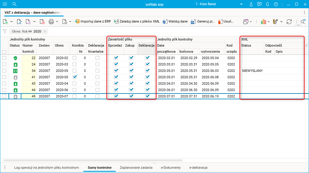 Nowy przekrój pozwala zobaczyć, jaki jest status wszystkich deklaracji z wybranego okresu dla wszystkich firm. Przekrój ten uwzględnia prawa użytkownika do firm, co oznacza, że użytkownik widzi nagłówki kontroli VDEK wyłącznie z firm, do których ma nadane uprawnienia.