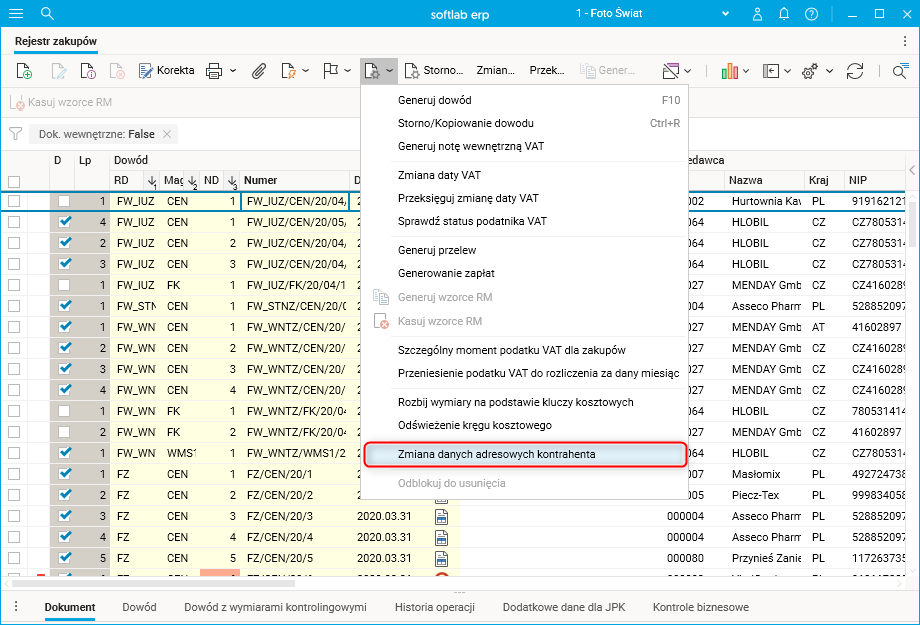 Natomiast dla dokumentów dotyczących zakupu (np. w słowniku Rejestr zakupów) zostały zastąpione procedury: