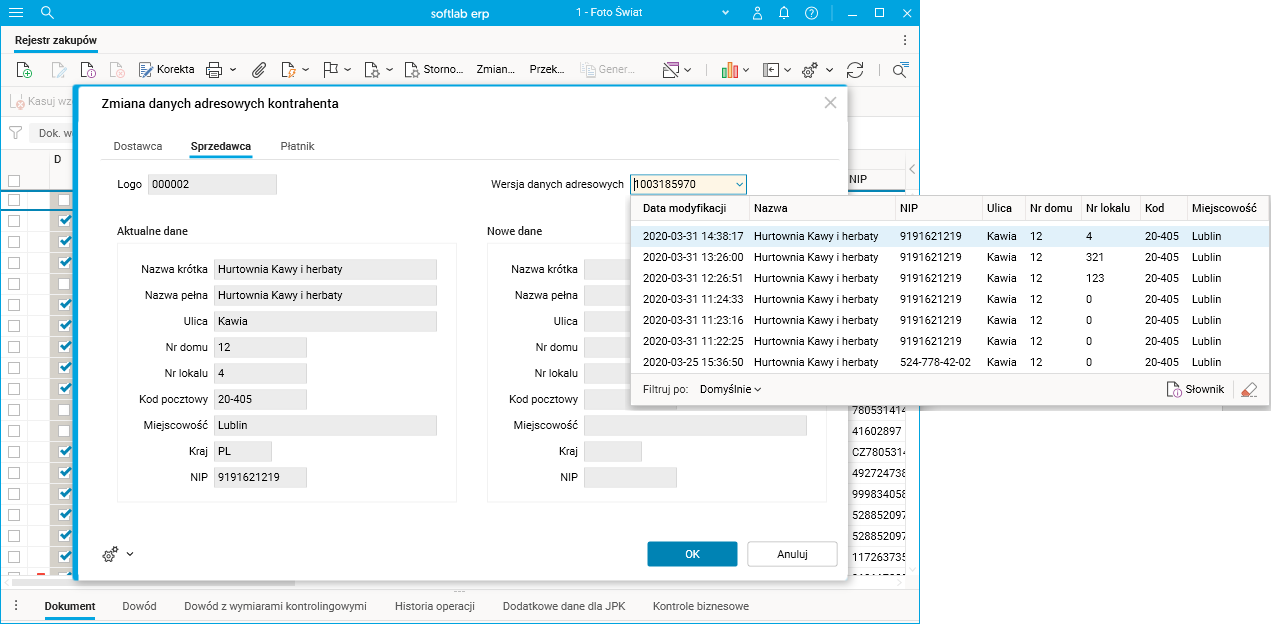Rys. Procedura Zmiana danych adresowych kontrahenta w słowniku Rejestr zakupów