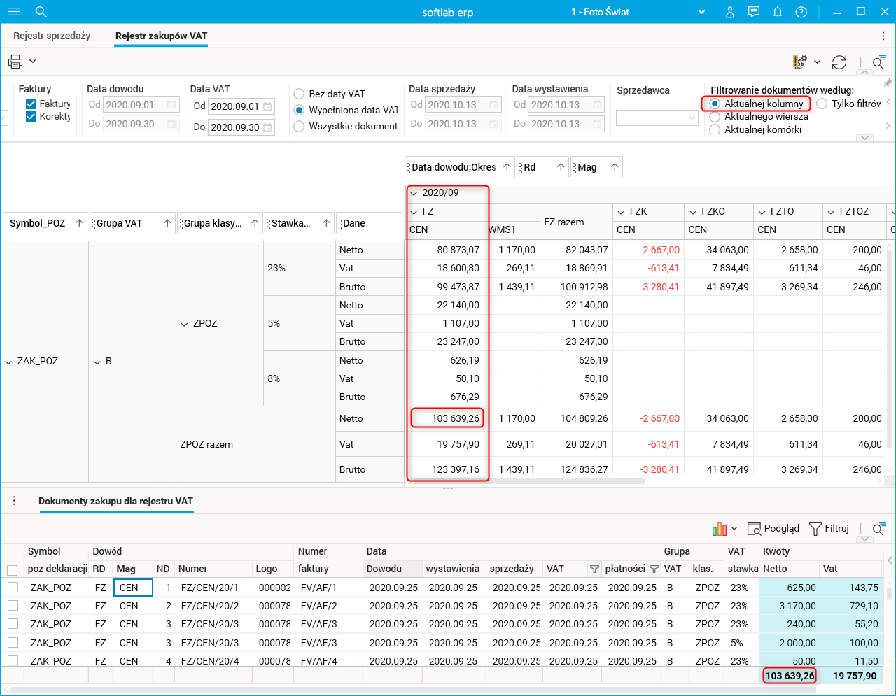 · Aktualnego wiersza – dokumenty są filtrowane według wartości z pól określających wiersze raportu, znajdujących się po lewej stronie tabeli przestawnej, czyli Symbol_POZ + Stawka VAT;Grupa + Grupa klasyfikacji + Stawka VAT,