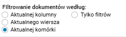 · Tylko filtrów – dokumenty są filtrowane tylko według filtrów, które znajdują się nad tabelą przestawną (nie jest brana pod uwagę komórka, na której ustawiony jest kursor).