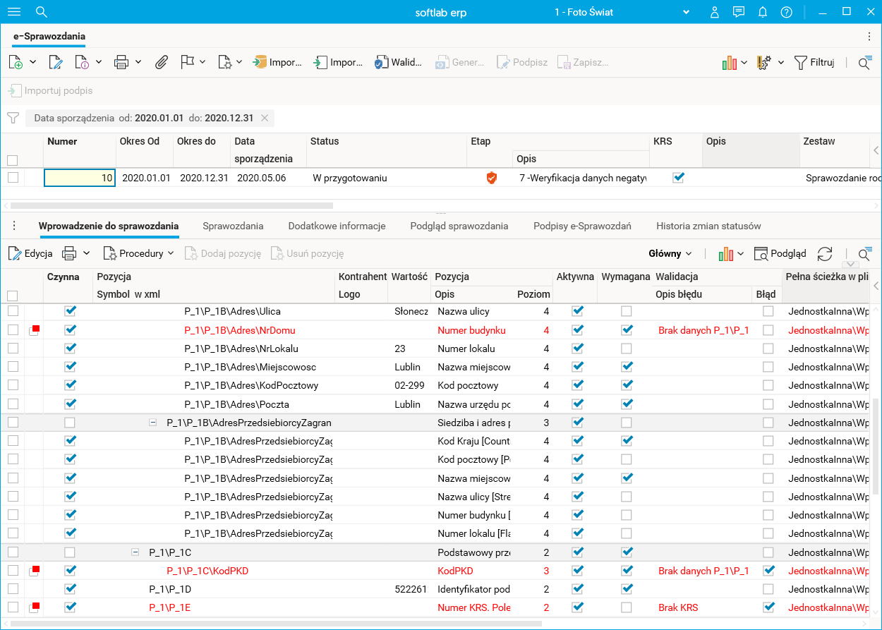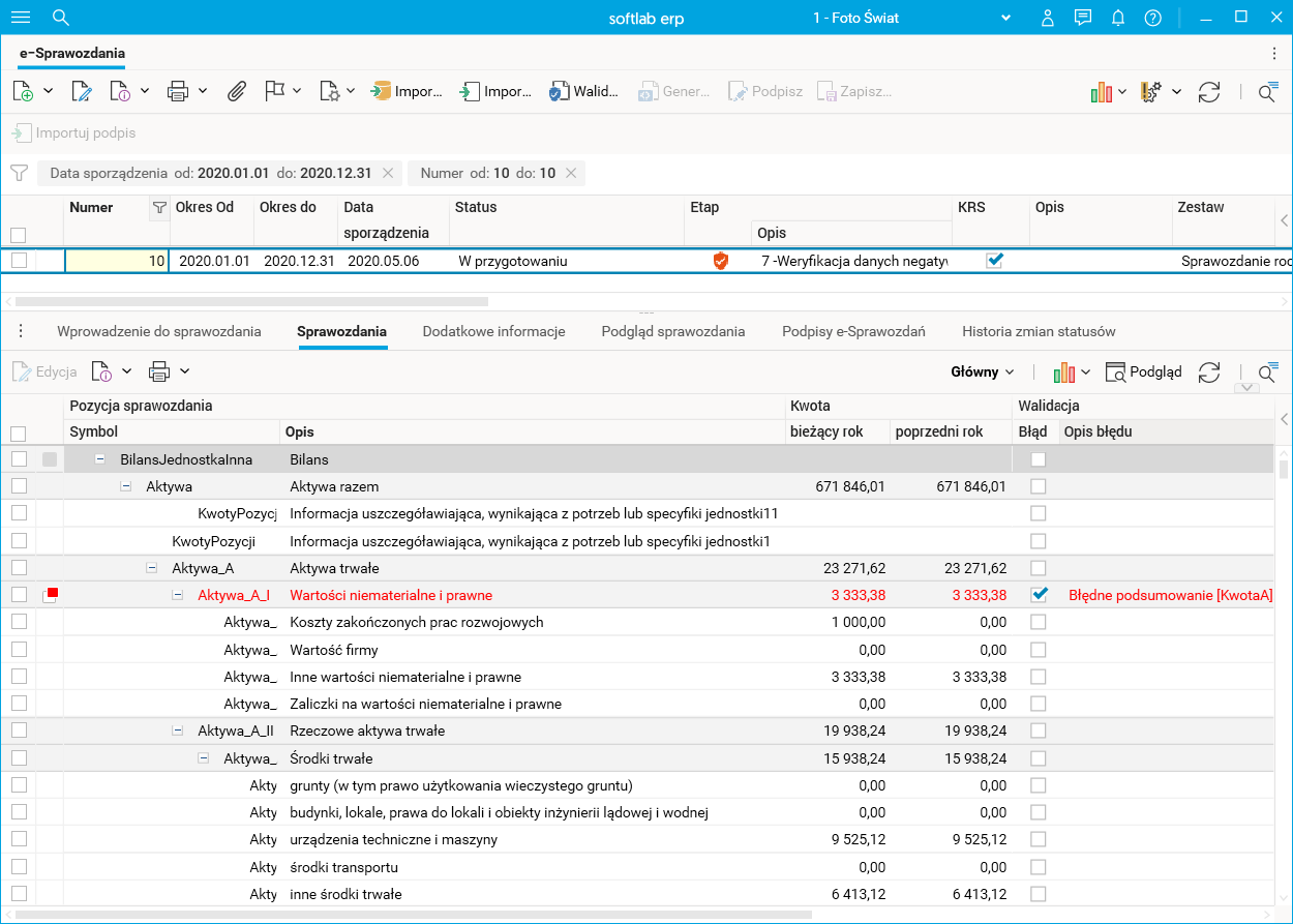 Dotychczas po wykonaniu walidacji danych w słowniku e-Sprawozdania błędne pozycje były widoczne tylko w wybranych szczegółach tego słownika, po wyborze przekroju Błędy walidacji danych.