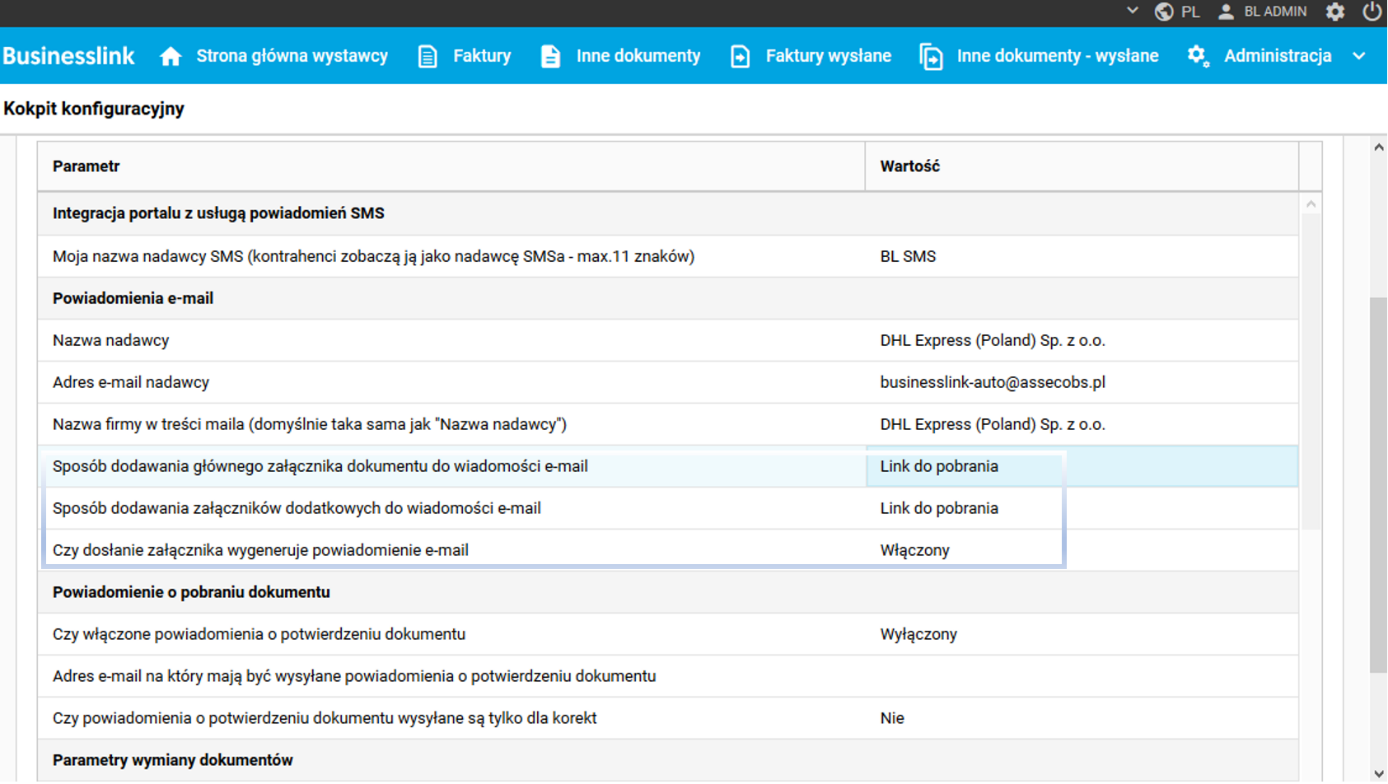 Na kokpicie konfiguracyjnym portalu, do którego dostęp ma użytkownik w roli administratora, w sekcji Powiadomienia e-mail, dotychczasowy parametr Sposób dodawania załączników do wiadomości e-mail został zastąpiony dwoma nowymi parametrami: