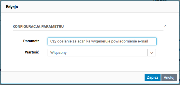 Powiadomienie o załączniku dodatkowym to kolejna nowa opcja udostępniona na pulpicie konfiguracyjnym portalu. Aby ją włączyć lub wyłączyć, należy zmienić wartość parametru Czy dosłanie załącznika wygeneruje powiadomienie e-mail.