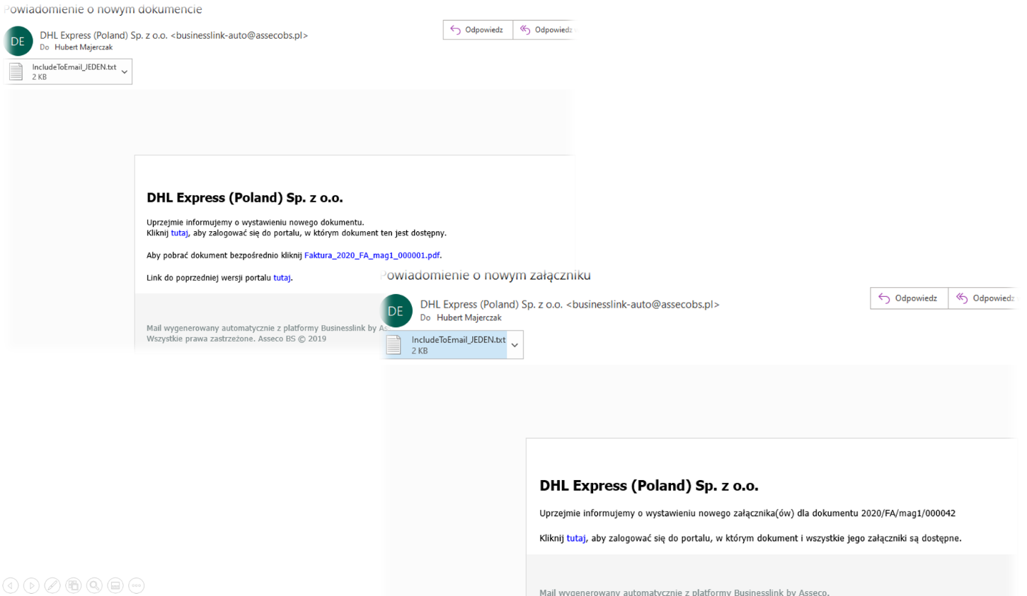 Rys. Porównanie wyglądu wiadomości e-mail dla konfiguracji 1: Link do pobrania + Załączniki w mailu