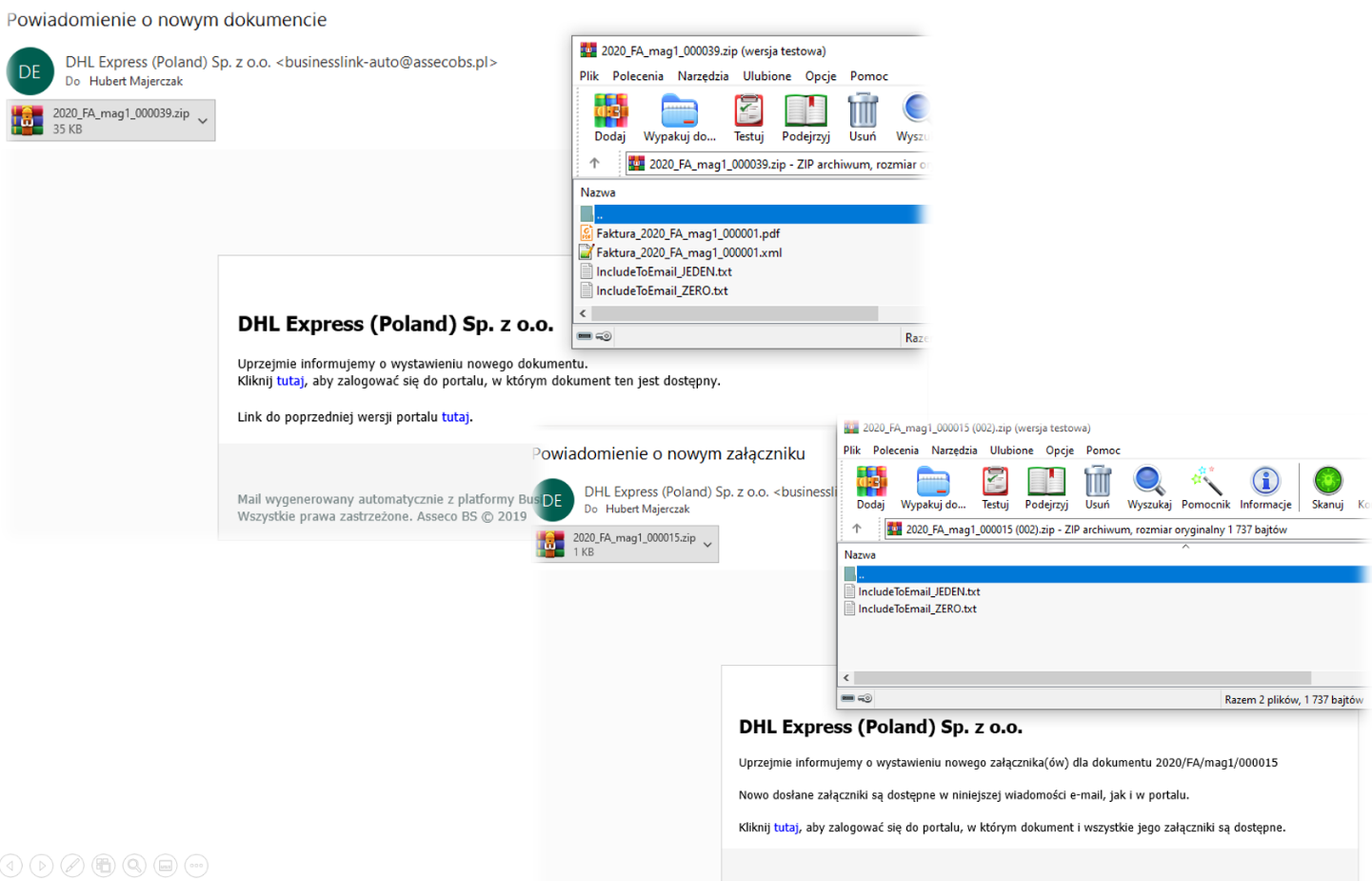Rys. Porównanie wyglądu wiadomości e-mail dla konfiguracji 2: Załącznik .zip + Załącznik .zip