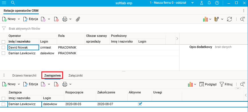 W słowniku Relacje operatorów CRM został dodany szczegół Zastępstwa. W tym szczególe można zdefiniować zastępstwo dla osoby we wskazanym okresie. W tym celu używamy akcji Nowy i podajemy następujące dane:
