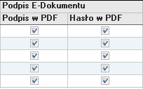 Aby wymusić nadanie hasła do podpisanego pliku PDF, należy upewnić się, że rodzaj e-dokumentu ma włączony podpis pliku PDF wewnątrz pliku (nie w postaci odrębnego pliku SIG). W tym celu należy uruchomić słownik Rodzaje E-Dokumentów (menu e-Dokumenty ® Konfiguracja ® Rodzaje e-Dokumentów) i dla danego typu e-dokumentu należy zaznaczyć obydwie flagi w grupie kolumn Podpis E-Dokumentu.