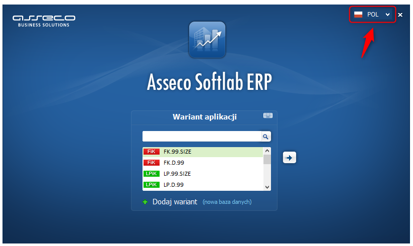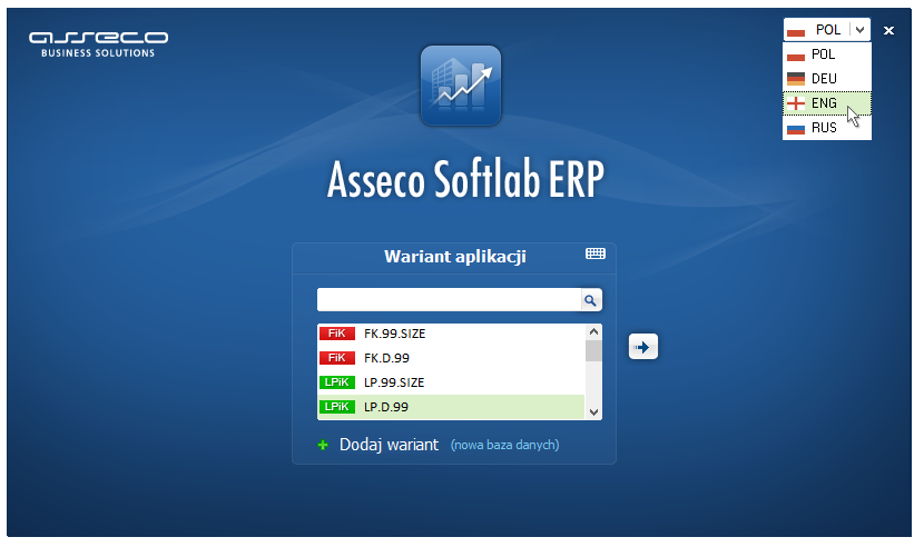 Ekran logowania aplikacji dostępowej EXE został wyposażony w listę rozwijaną dającą możliwość wyboru wersji językowej jeszcze przed zalogowaniem się do systemu. Wybór jest zapamiętywany z dokładnością do użytkownika. Dzięki temu użytkownik danej stacji roboczej może samodzielnie podjąć decyzję, którego wariantu językowego chce używać podczas pracy z interfejsem aplikacji.