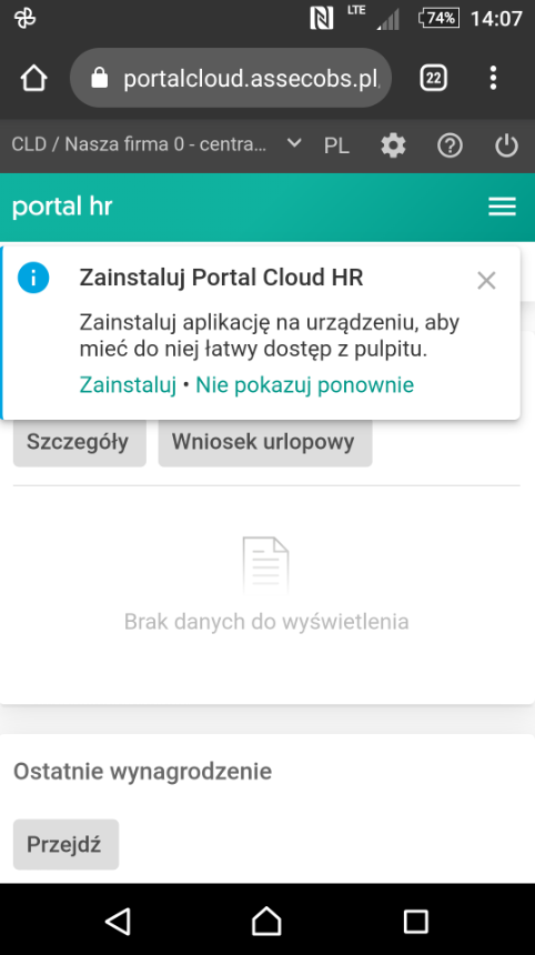 Aby zainstalować aplikację na urządzeniu, należy uruchomić odpowiednią stronę w przeglądarce internetowej (np. stronę z Portalem HR jak na rys. 1) i zalogować się na urządzeniu. Ważne jest, aby po zalogowaniu wyrazić zgodę na otrzymywanie powiadomień ze strony aplikacji. Po udzieleniu zgody pojawi się powiadomienie z pytaniem o instalację aplikacji na urządzeniu. Należy kliknąć Zainstaluj.