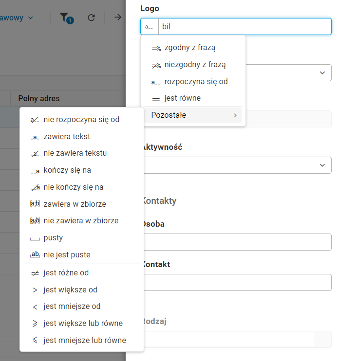 Uwaga! Lista dostępnych operatorów zależy od typu filtra.