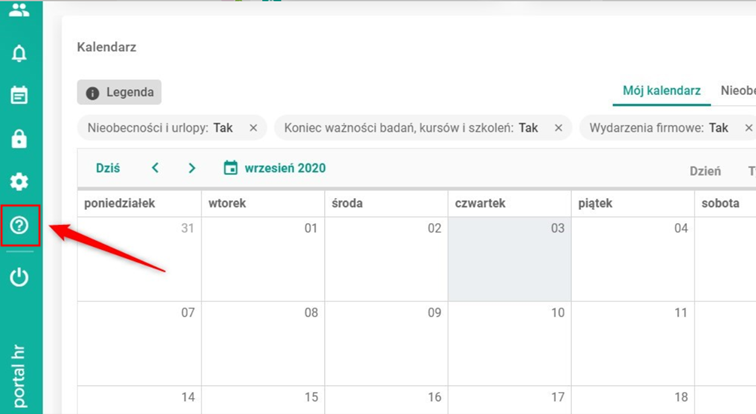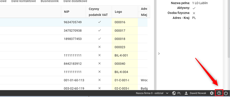 System pomocy możemy wywołać za pomocą przycisku pomocy , który znajduje się na pasku statusu w prawym dolnym rogu okna (obok przycisku Wyloguj):