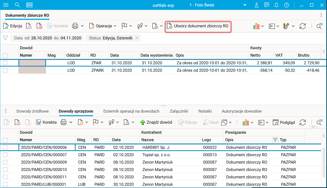Dokumenty zbiorcze tworzymy w słowniku Dokumenty zbiorcze RO za pomocą procedury Utwórz dokument zbiorczy RO.