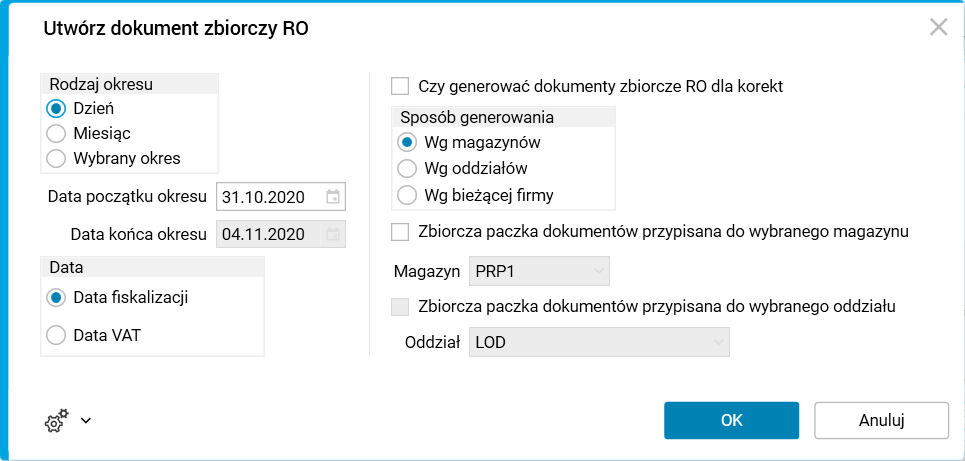 ·         Dzień – dokument zbiorczy RO będzie zawierał paragony zafiskalizowane/utworzone w wybranym dniu. Przy wyborze tej opcji uwzględniana jest data ustawiona w polu Data początku okresu.