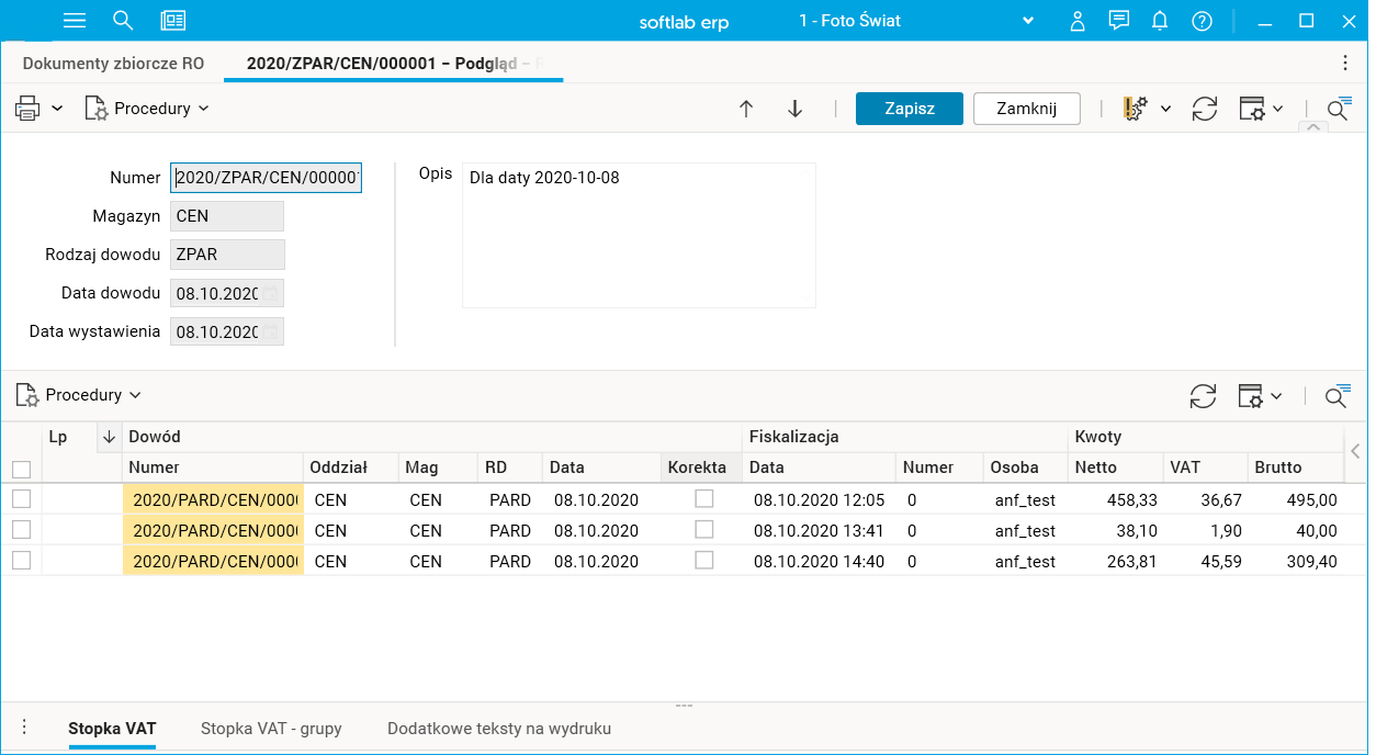 W tym celu utworzono nowy słownik Dokumenty zbiorcze RO, w którym można generować, edytować i przenosić do dziennika zbiorcze raporty fiskalne.