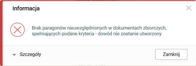 Jeżeli w systemie nie ma już paragonów nieprzypisanych do żadnego dokumentu zbiorczego, a użytkownik uruchomi procedurę generującą taki dokument, to pojawi się komunikat informacyjny, że nie ma paragonów spełniających podane kryteria i dokument zbiorczy nie zostanie utworzony.