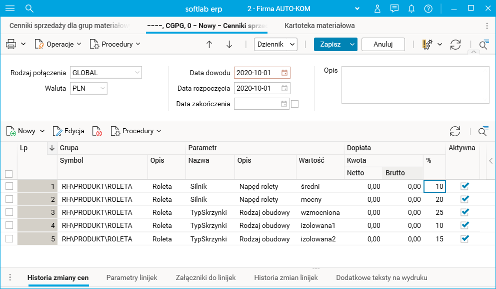 W tym celu w nowym rodzaju cennika Cennik sprzedaży dla grup materiałowych wg parametrów dodano możliwość określenia dopłaty procentowej związanej z daną wartością parametru. Dopłata wyliczana jest tylko, gdy podstawowa cena towaru pochodzi z innego cennika (a nie została wprowadzona ręcznie), co ma przeciwdziałać nieautoryzowanej zmianie ceny.
