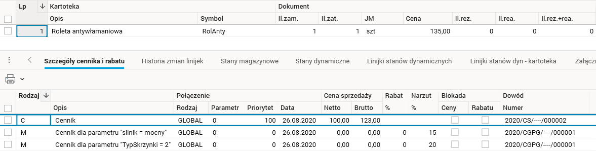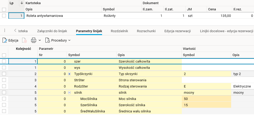 Poniżej podano przykład działania nowego mechanizmu – na zamówieniu od odbiorcy umieszczono roletę antywłamaniową, a szczegół Parametry linijek podaje parametry tej rolety.