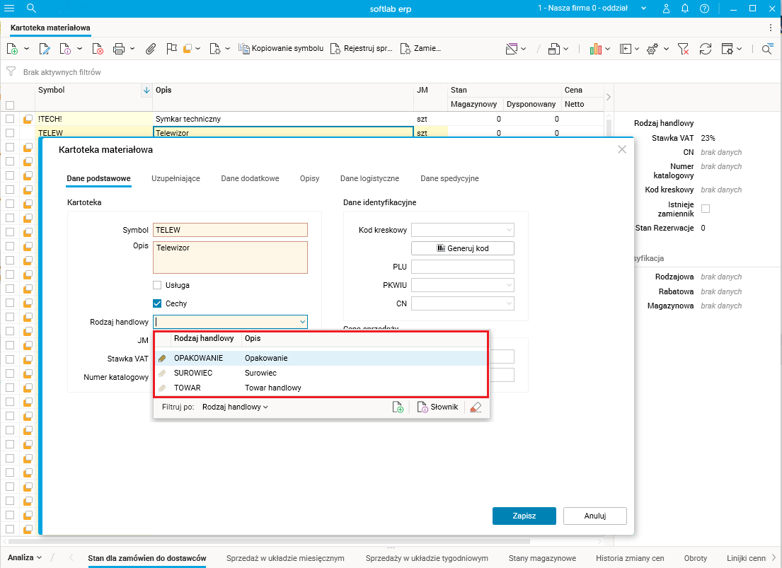Dzięki tej zmianie podczas definiowania kartoteki w słowniku Kartoteka materiałowa lista możliwych do wybrania rodzajów handlowych jest ograniczona tylko do aktywnych. Ograniczony wybór ułatwia wskazanie odpowiedniego rodzaju handlowego.