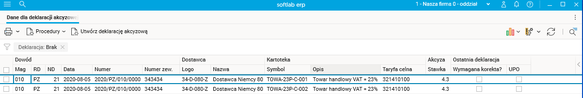W zależności od ustawienia filtra Deklaracja słownik może prezentować pozycje nierozliczone lub rozliczone. Ustawienie wartości Brak (brak deklaracji, wartość domyślna) służy do prezentowania pozycji oczekujących na utworzenie deklaracji. Natomiast ustawienie Jest (jest deklaracja) umożliwia przeglądanie danych historycznych. W szczególe Deklaracje akcyzowe można sprawdzić, czy i jaką deklaracją dana pozycja została rozliczona.