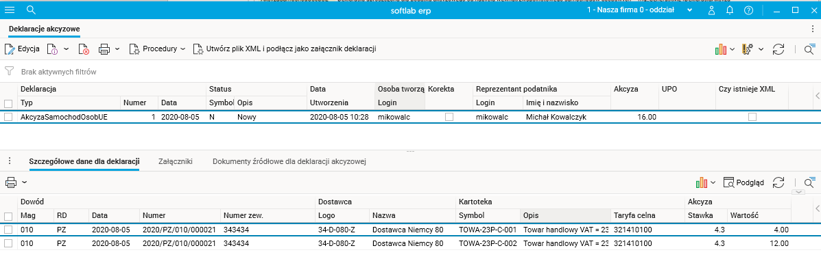 Deklarację tworzy się dostępną w słowniku procedurą Utwórz deklarację akcyzową. Wygenerowane za jej pomocą deklaracje widoczne są w słowniku Deklaracje akcyzowe.