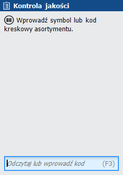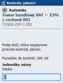 Jeśli tak, wówczas wygenerowany zostaje protokół kontroli PKJ i rozpoczyna się kontrola jakości. Kontrola polega na wprowadzeniu kodu kreskowego towaru, cechy i zarejestrowaniu ilości, które przeszły kontrolę negatywnie i pozytywnie.